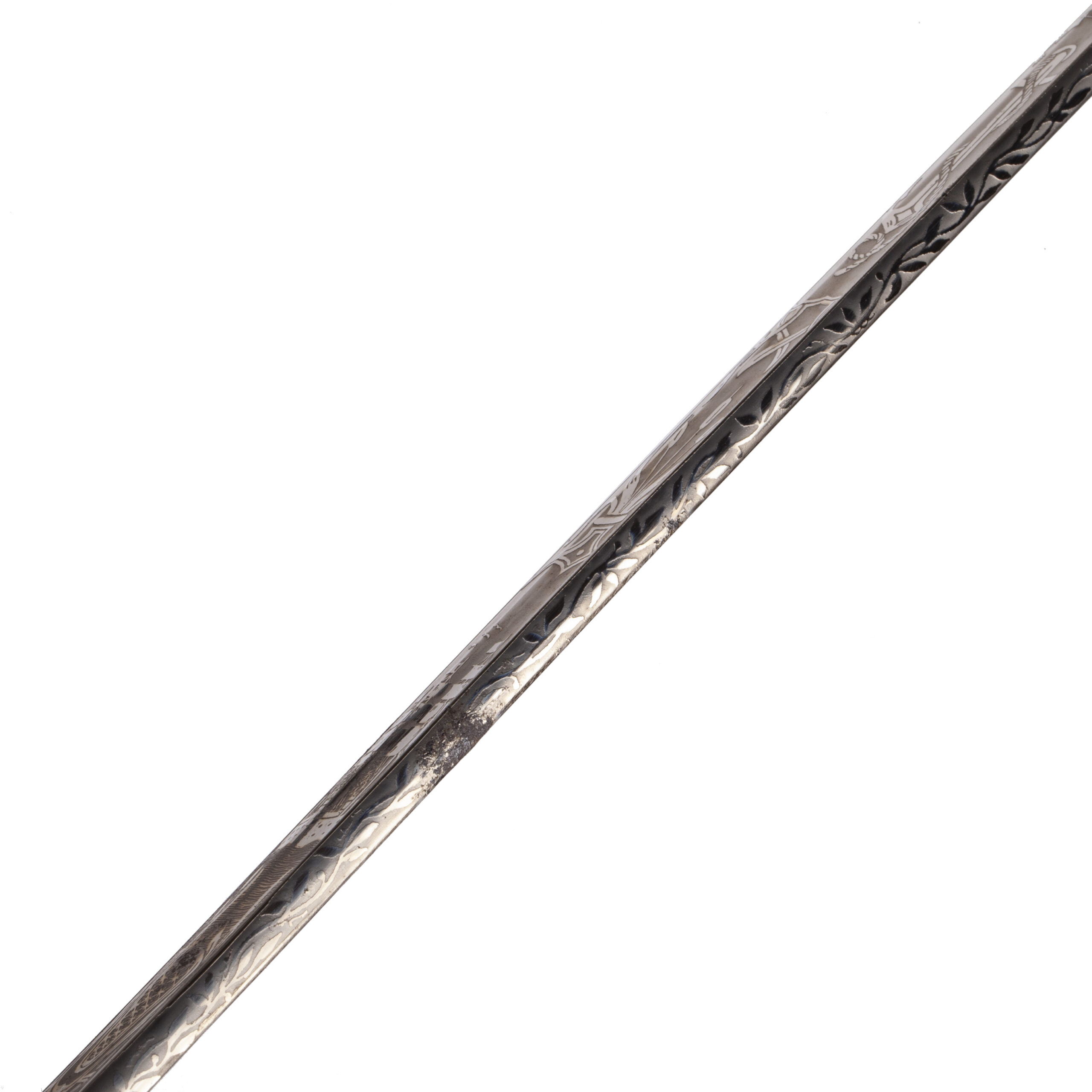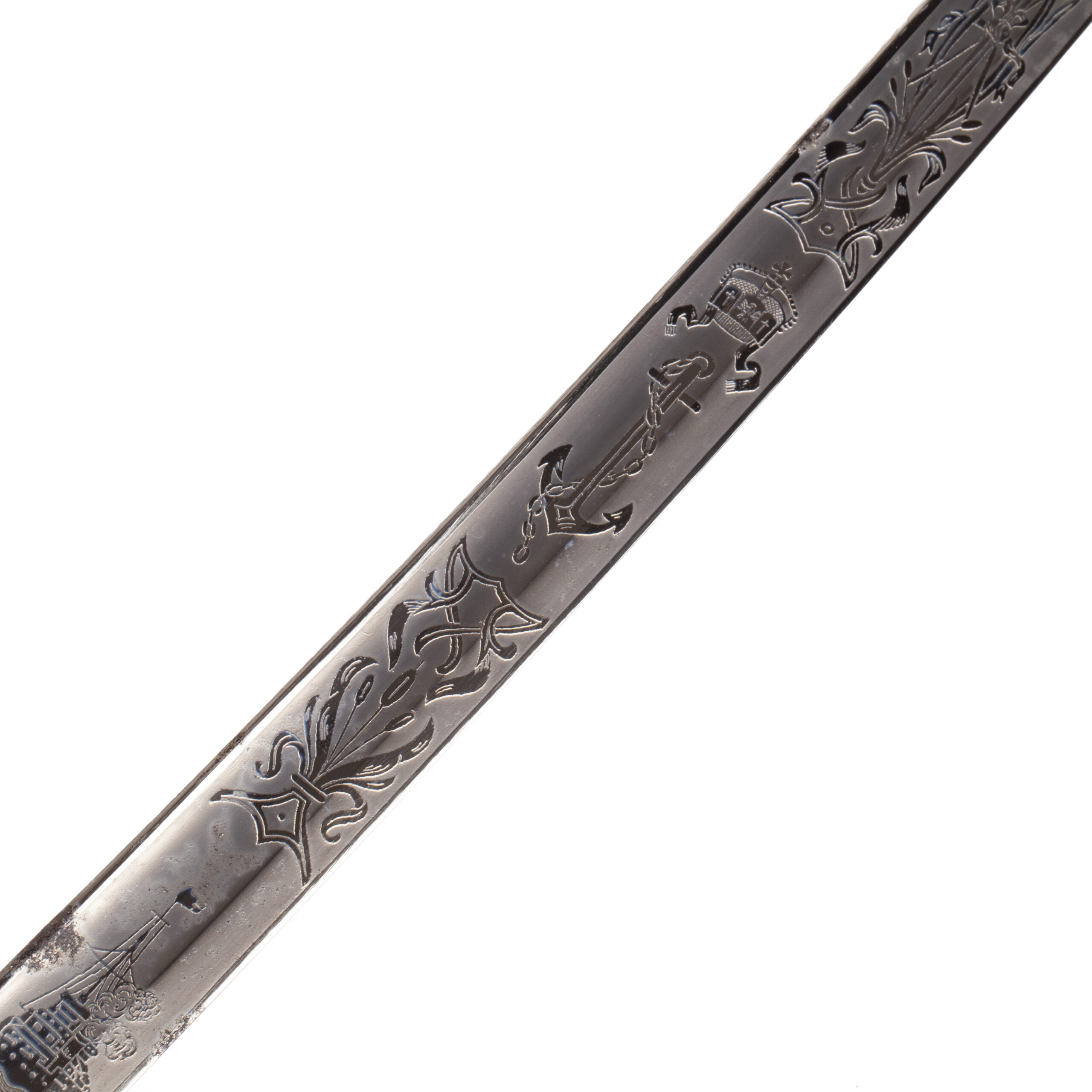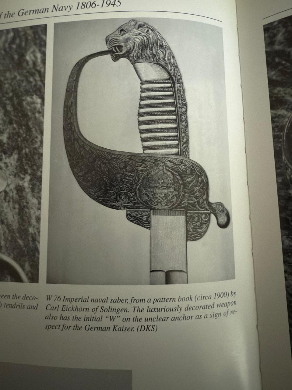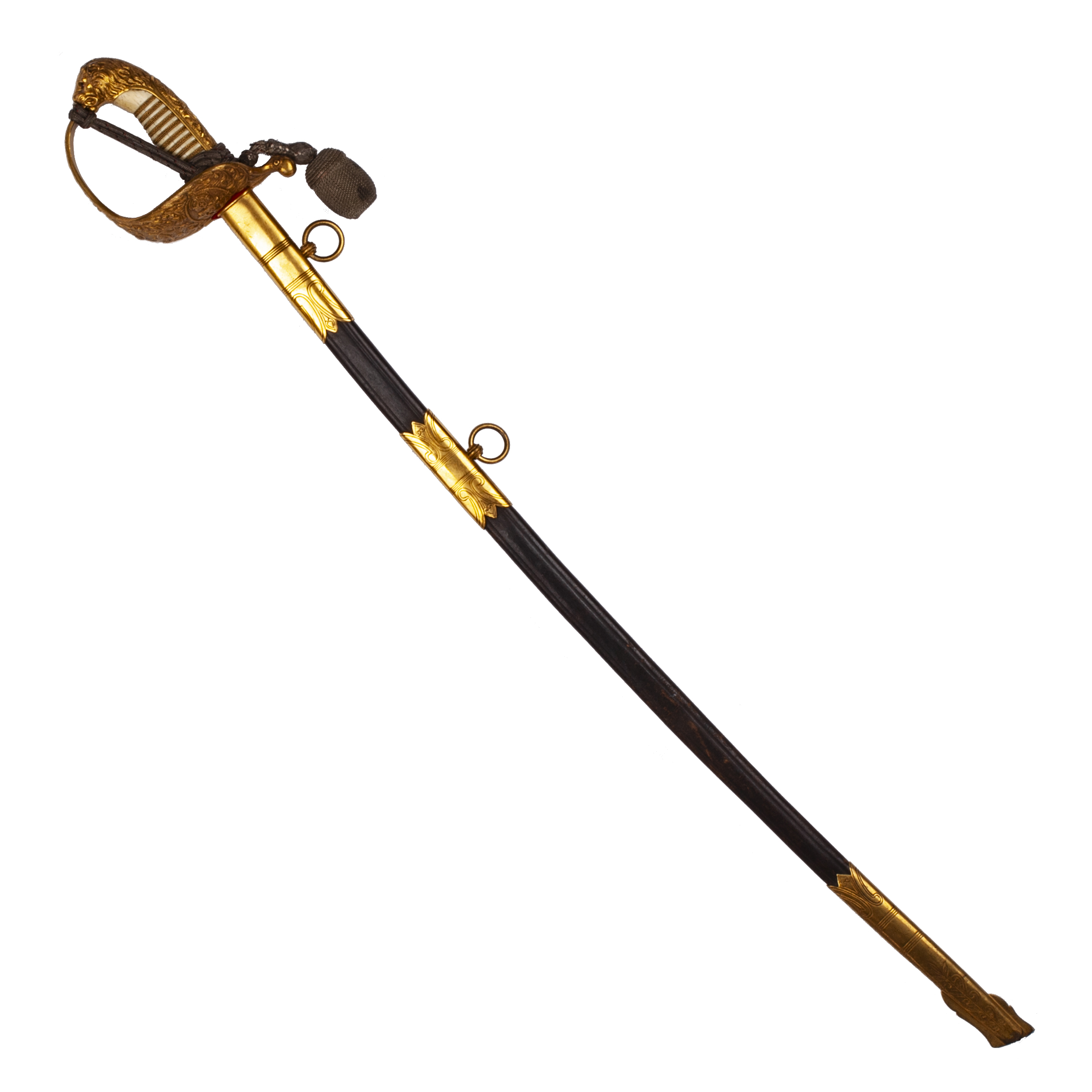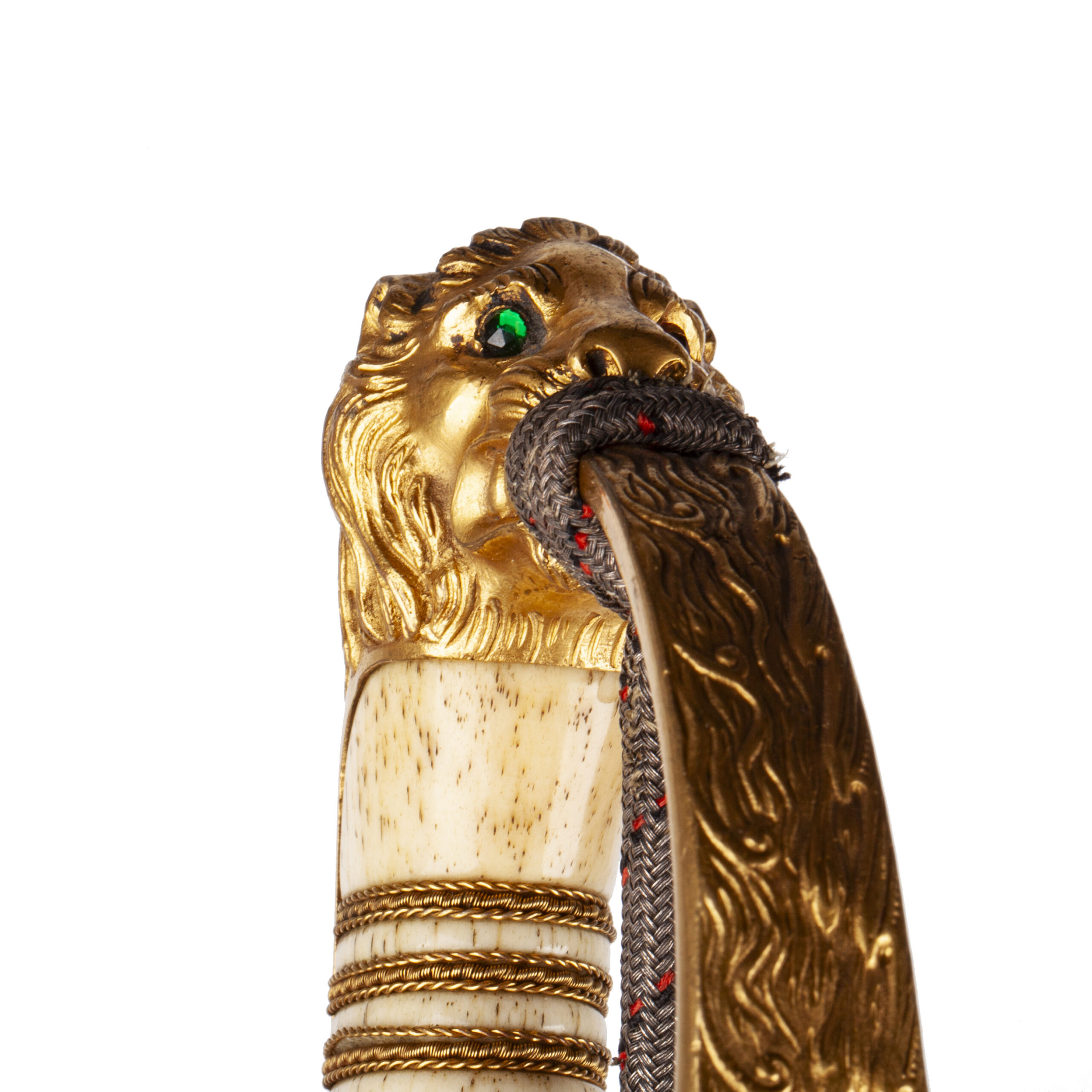 A finely crafted Imperial Naval saber. This luxuriously decorated weapon bears the initial “W” on an anchor motif, signifying respect for the German Kaiser. The lion’s head pommel is set with red and green gemstone eyes, and the grip is elegantly wrapped with gilt wire.