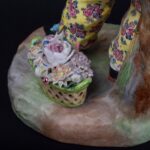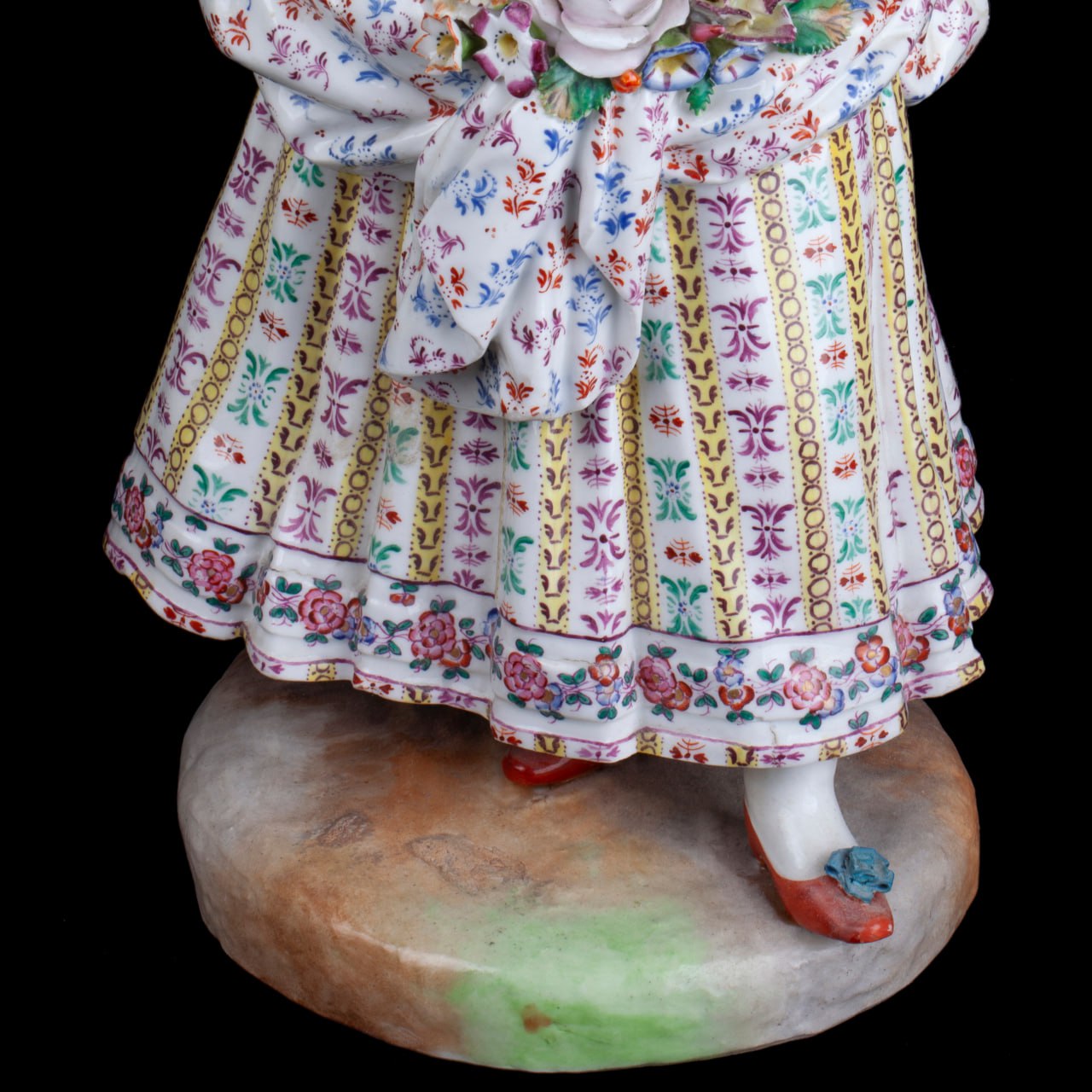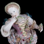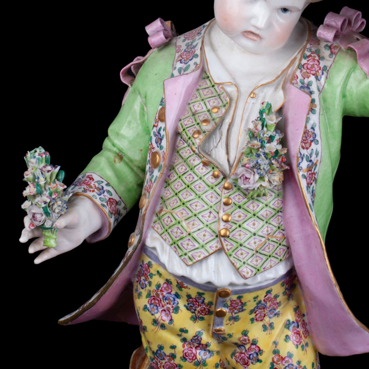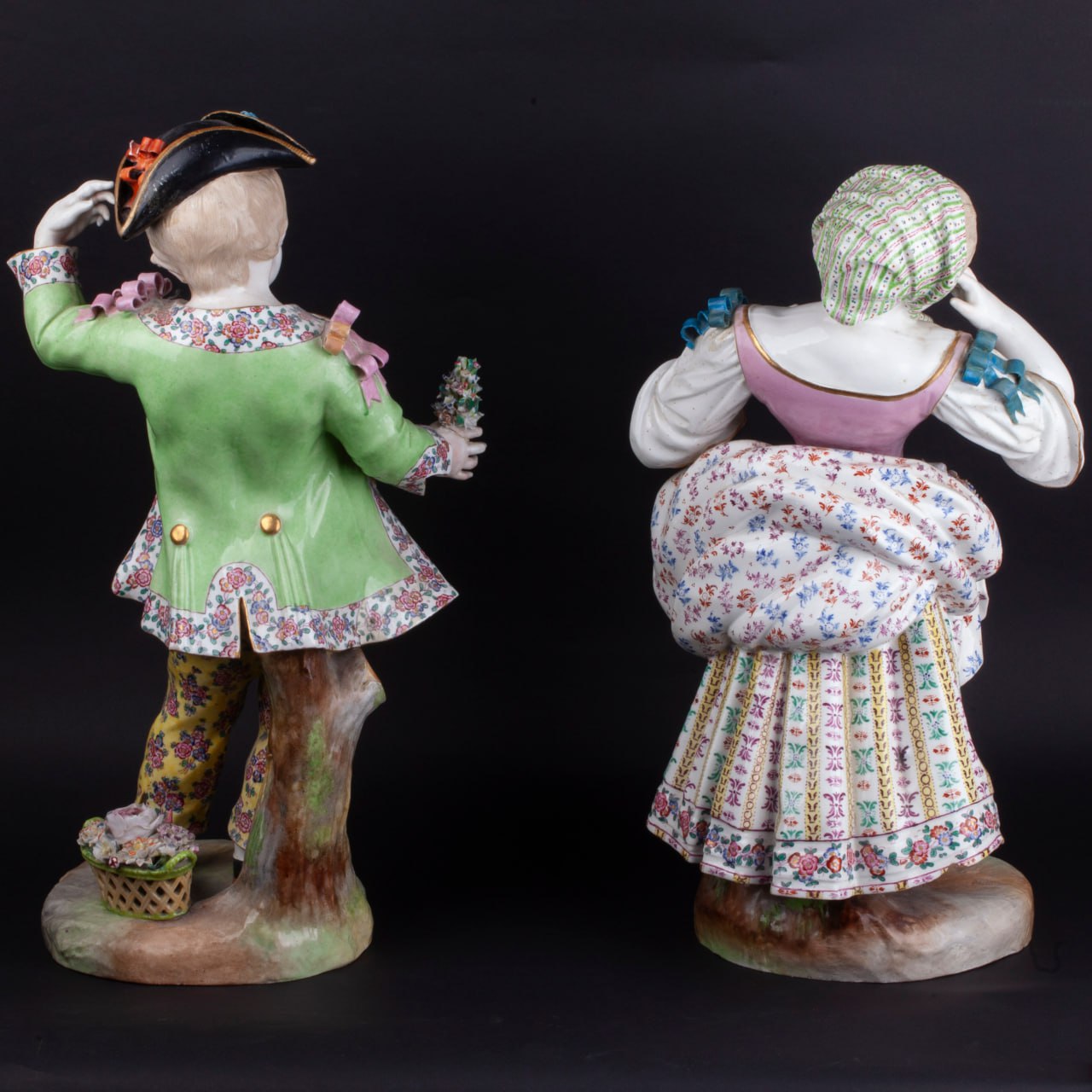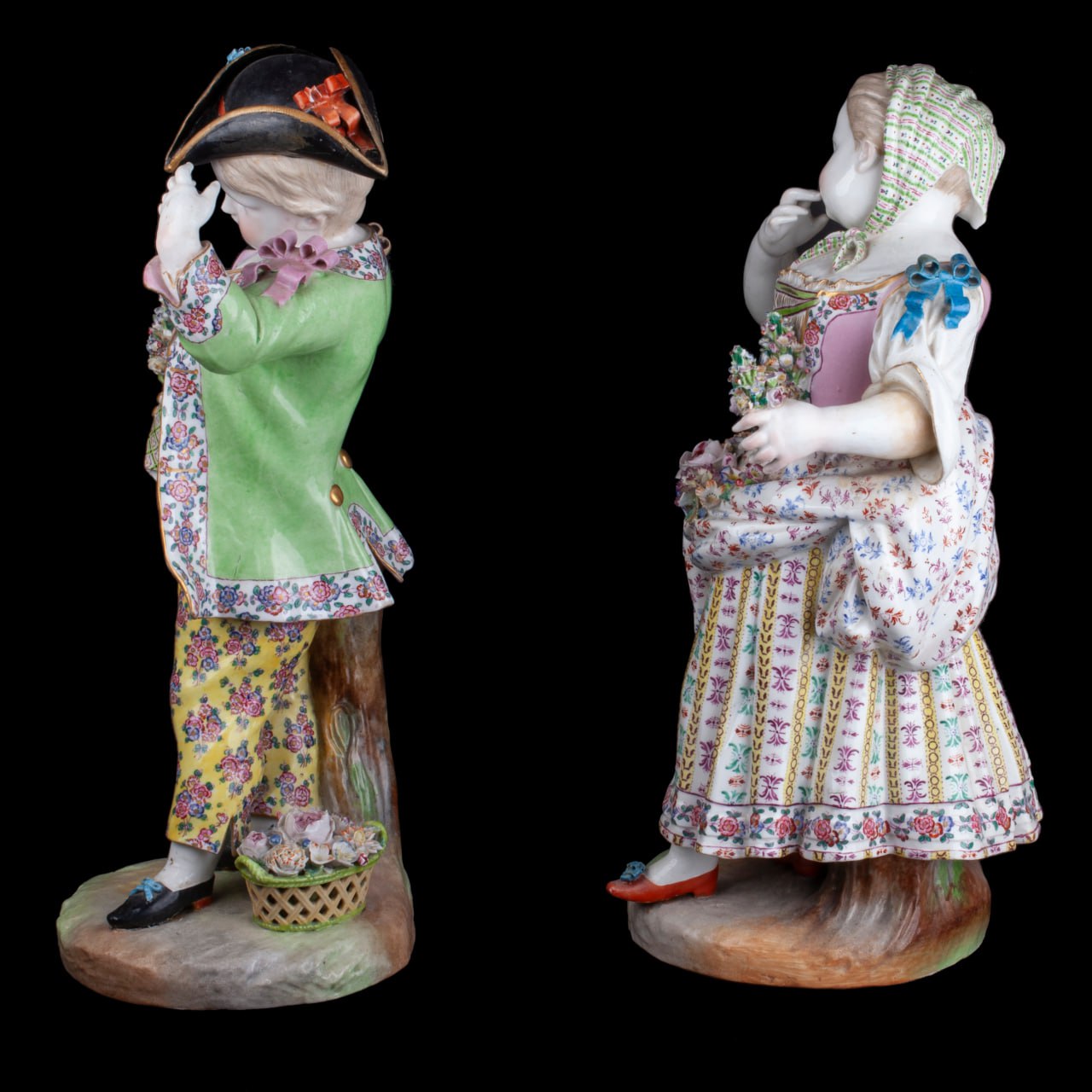 Colossal and graceful pair of Meissen-style porcelain figurines, each 40 cm tall and standing on a 17 cm diameter base. Hand-painted in the classic 18-century palette, the boy and girl are captured in elegant Rococo poses, their lace-trimmed costumes, floral bouquets and gilded highlights modelled with museum-grade detail.