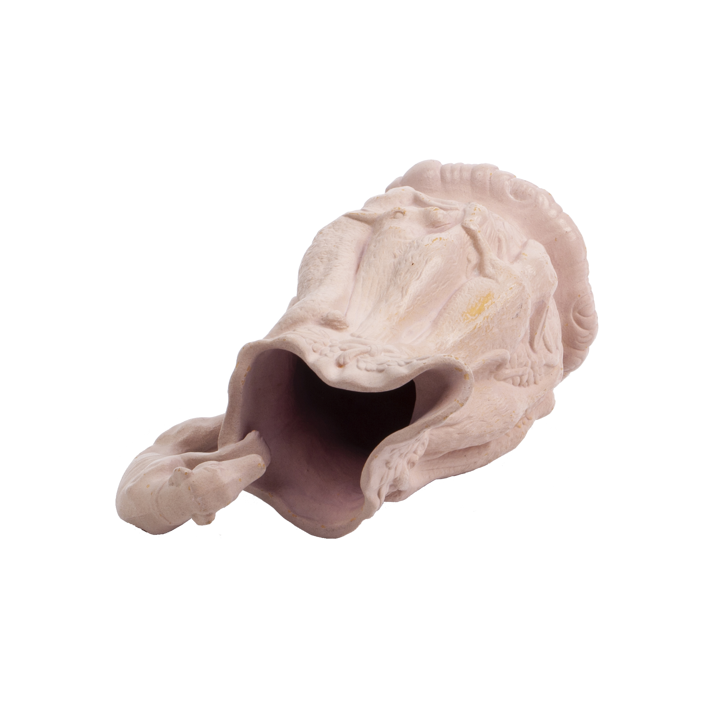 A rare faience pitcher decorated with reliefs of hunting trophies—small game animals—and a handle in the form of a fox peering into the vessel. The design recalls the rustic wares of Bernard Palissy (ca. 1510–1589), the French Renaissance ceramicist celebrated for his naturalistic reliefs of plants and animals.