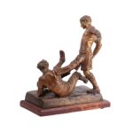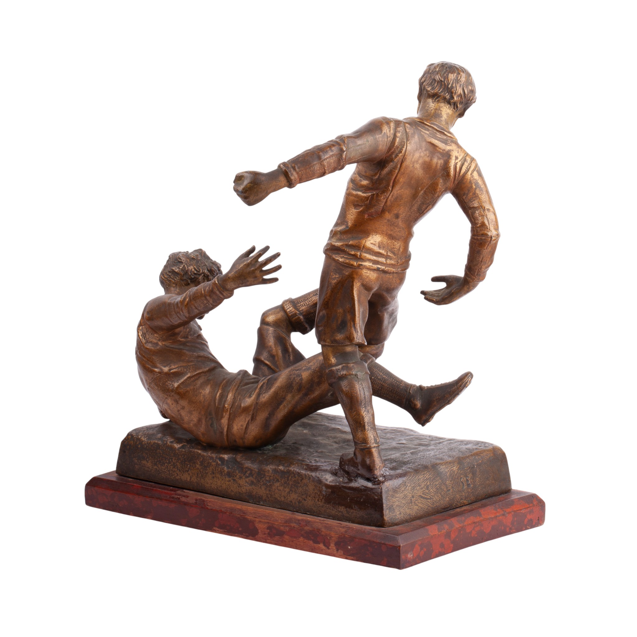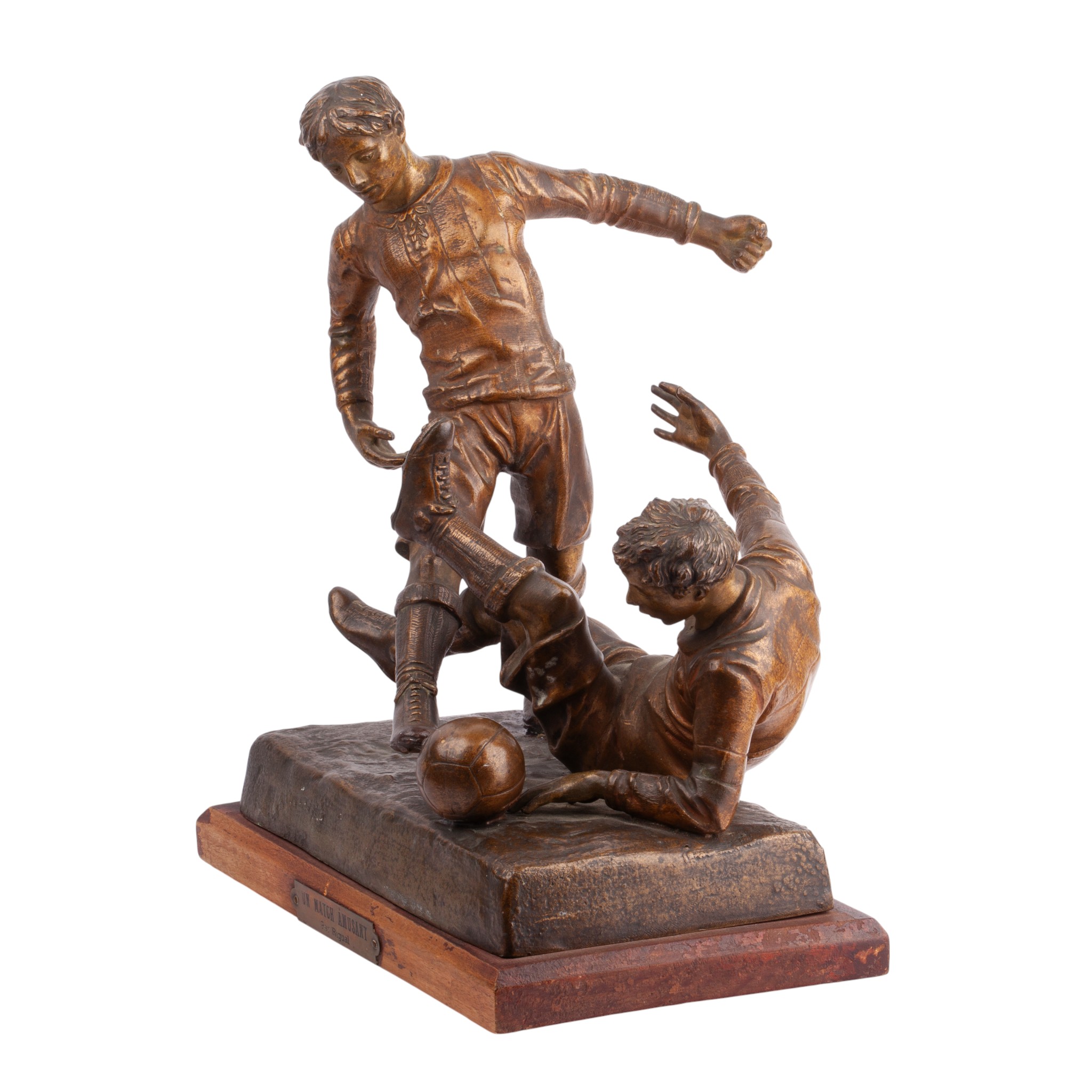 A stunning piece of early 20th-century sporting history, capturing the dynamic energy of a football match. This vintage spelter figurine is a classic example of French “Sporting Plastic” from the Art Deco era. It depicts a high-stakes moment between two players in authentic period kits, showcasing movement and detail.