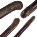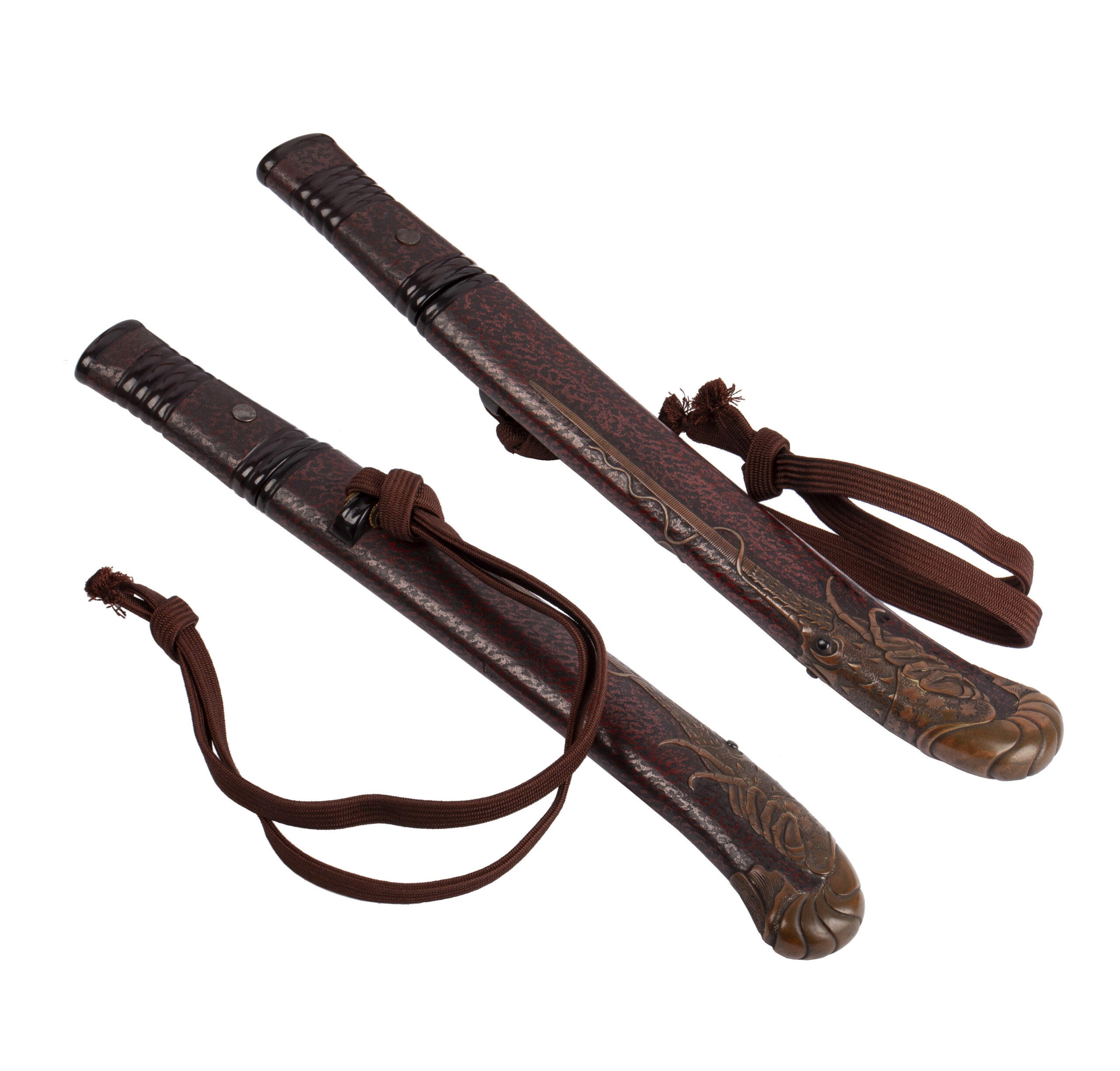 刀装 (koshirae) 上雕刻立体龙虾(伊势虾,ise-ebi)图案,采用雕金与锤金 (kinkō) 技法。龙虾在日本象征长寿、尊敬与高贵,常用于武士阶层赠礼刀剑。