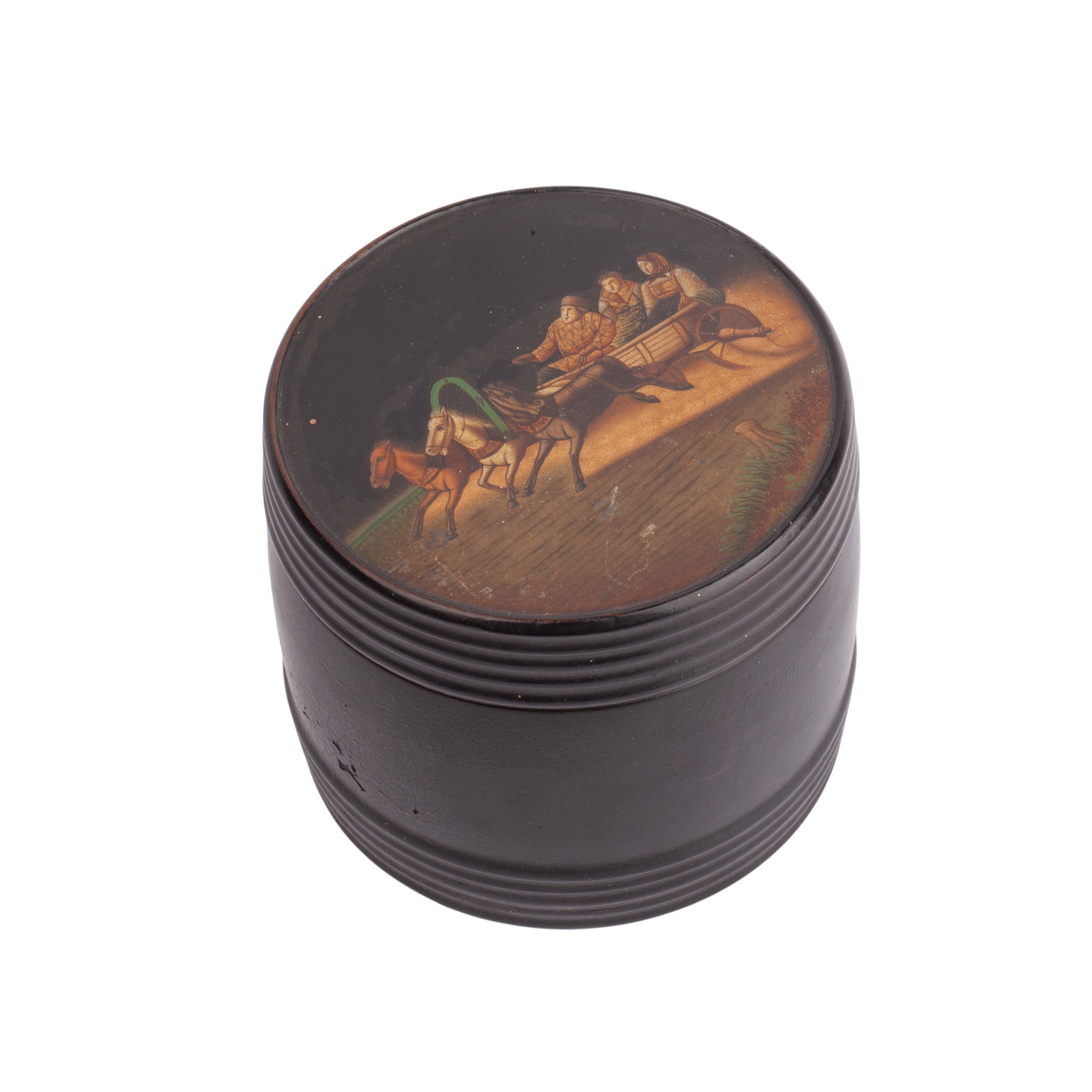 A collectible papier-mâché tea caddy featuring hand-painted lacquer art. This piece originates from the renowned Vishnyakov workshop. It is a rare example of early 20th-century decorative art, representing a famous Russian traditional craft. The caddy is decorated with a classic lacquer painting of a traditional Russian Troika (three-horse carriage).